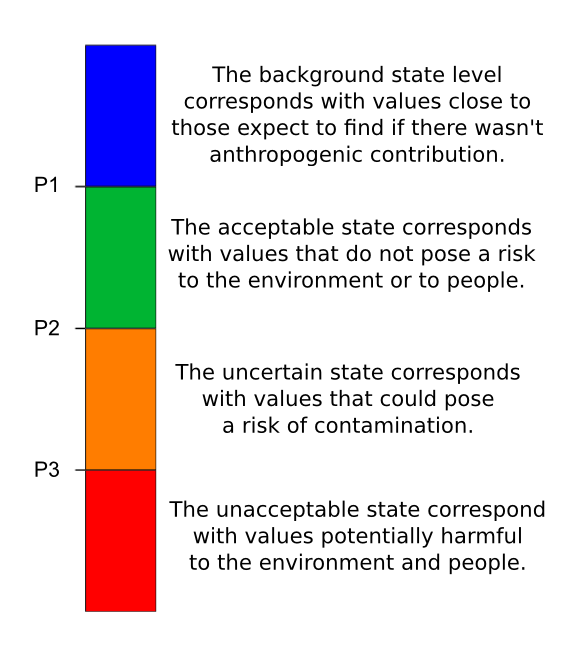 The chemical quality status is represented by a traffic light color code, similar to the one used by the OSPAR Commission in its Quality Status Report, for what they propose as cut-off points to separate the different environmental states as a function of concentrations or response metrics. It has been used three boundary values or cutoff points (P1, P2 and P3) which leads to four ecological states: background, acceptable, uncertain and unacceptable.